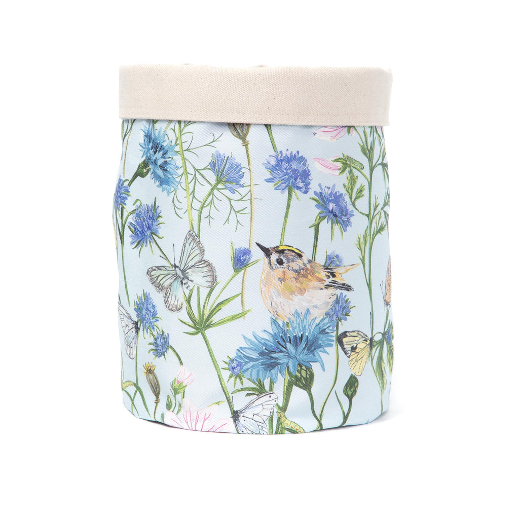 A lovely fabric basket is made with my handprinted fabric design on the front, featuring Long tailed tits, foxgloves and bees. The pot bag is lined using a stiff, strong cotton canvas inner, to hold its shape.