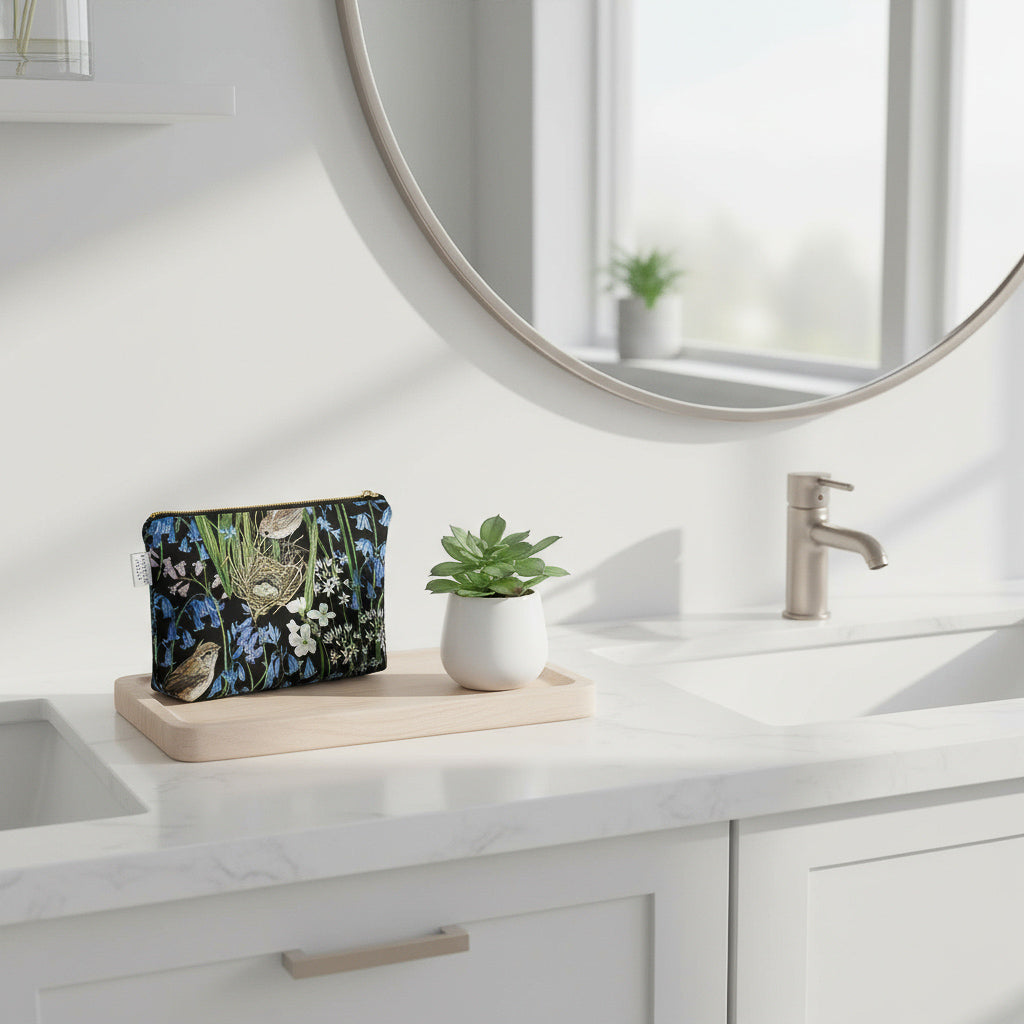 This lovely Robin and Mistletoe wash bag is made from my fabric featuring Robins, holly, mushrooms, ecalyptus and moths. It has white waterproof lining, and is complete with a large gold and black zip.